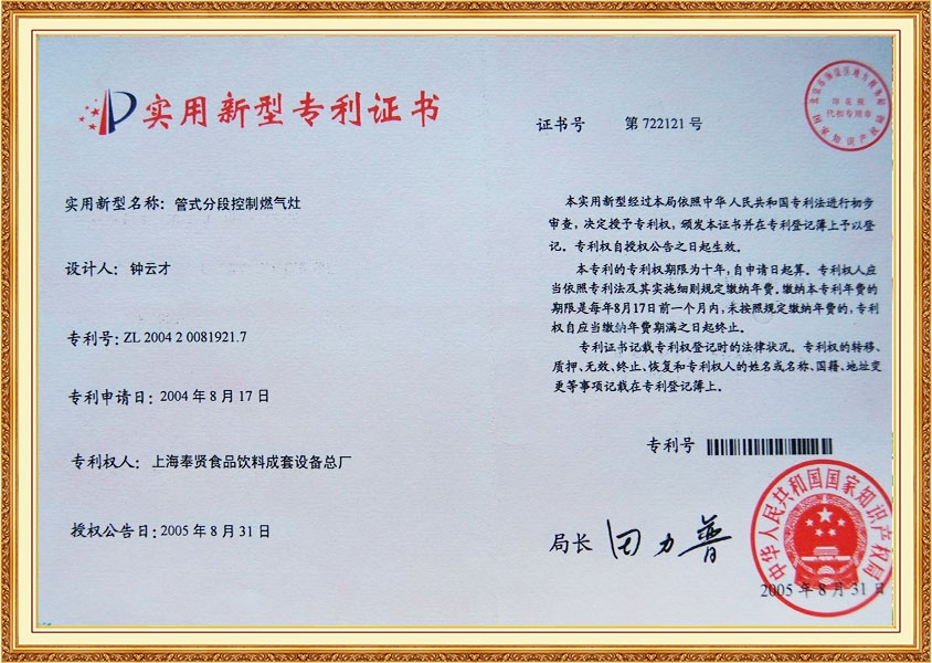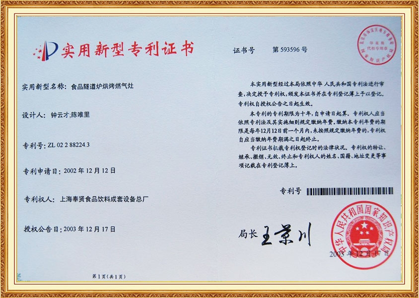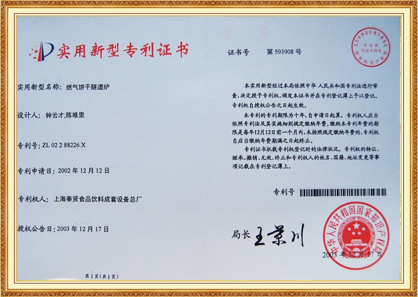 Патентный сертификат Газовая туннельная печь для обработки печенья
