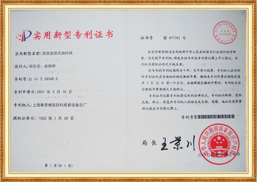 Патентный сертификат Высокоэффективная фритюрница непрерывного действия