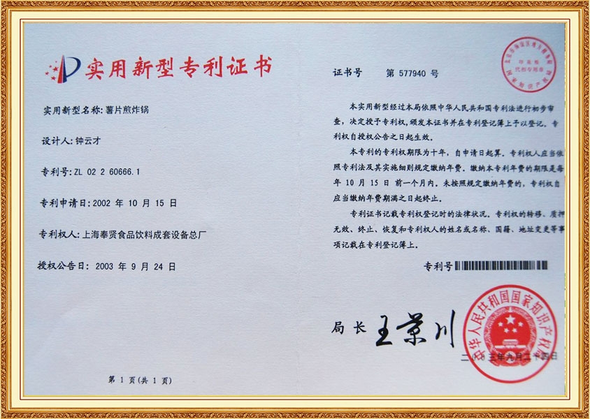 Патентный сертификат Картофельные чипсы Масло Жареная печь