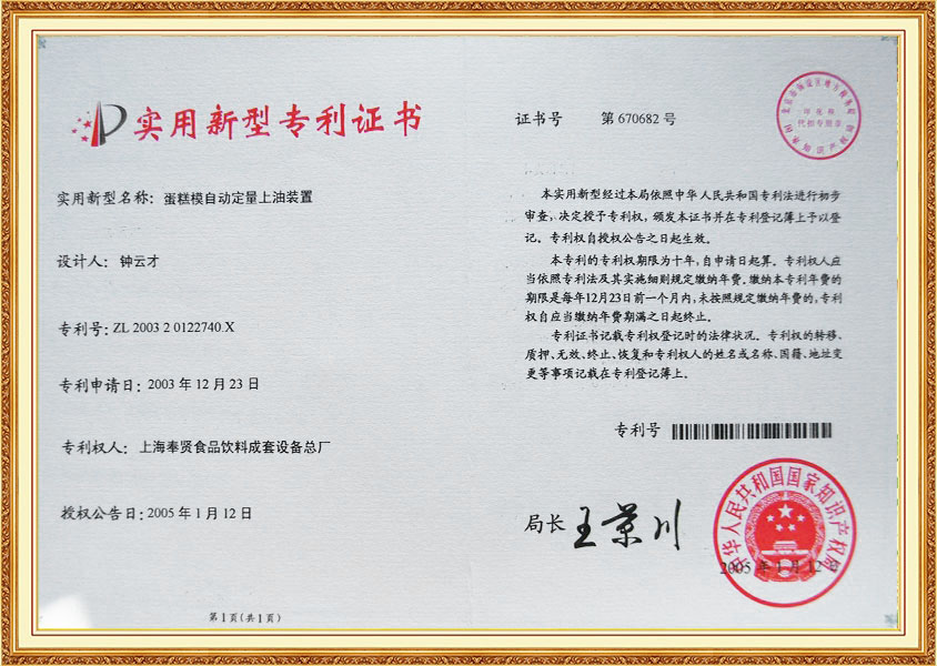 Патентный сертификат Система количественной подачи масла на линии по производству тортов