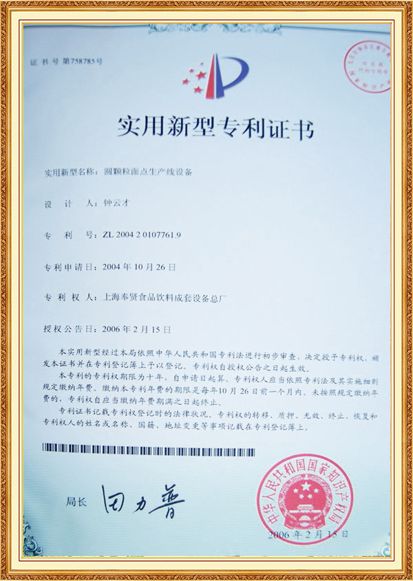 Патентный сертификат Rond Flour Оборудование для пищевой промышленности