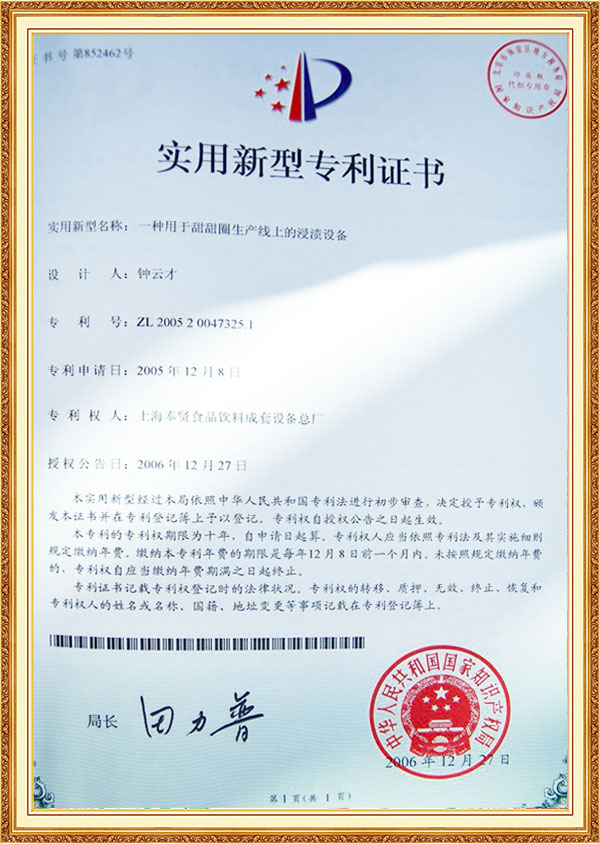 Патентный сертификат на машину для замачивания линии по производству орехов