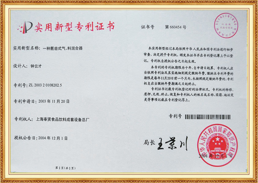 Патентный сертификат типа смесителя Laybrinth для воздуха и материалов