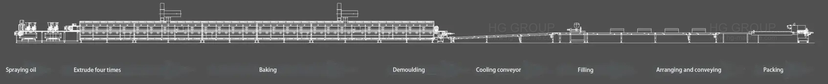 Основное оборудование: маслораспылитель, экструдер, печь для выпечки, автомат для извлечения из форм, конвейер, машина для начинки, упаковочная машина.