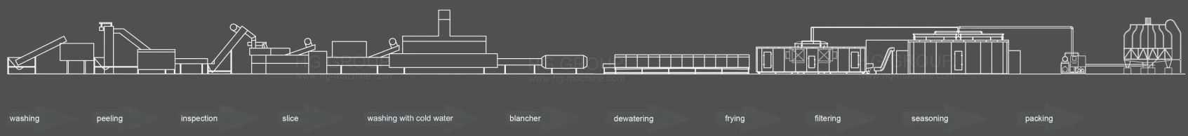 Наша линия по производству картофельных чипсов использует в качестве сырья свежий картофель и позволяет получать вкусные чипсы посредством мойки, очистки, нарезки, обжарки в масле и добавления вкусоароматических веществ. Наша производственная линия является очень современной. Например, бланширователь использует для прямого нагрева пар из парового котла. После бланширования мы применяем высоконапорный воздуходув для удаления влаги с чипсов перед их обжаркой. После процесса обжарки производится удаление излишков масла и добавление приправ.Основное оборудование: Моечная и камнеотборочная машина, Очистительная машина , Резательная машина, Бланширователь, Фритюрница, Машина для добавления приправ .