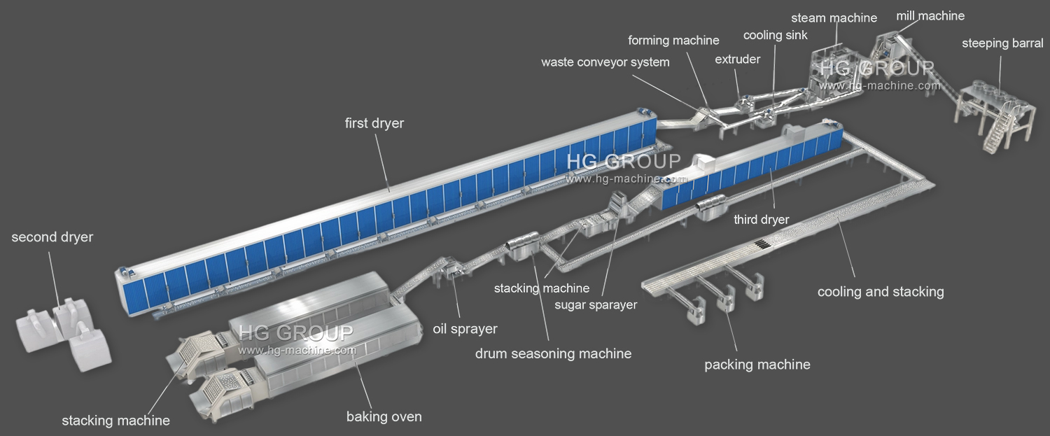 Данная полностью автоматизированная линия по производству снежных рисовых крекеров интегрирует передовое оборудование для обработки таких крекеров из Японии и Тайваня. Сохраняя основные принципы производства, она оптимизирована с учётом особенностей китайских сортов риса и требований крупномасштабного выпуска продукции. Линия состоит из четырёх участков: помола, формования, вспучивания и добавления приправ, а также упаковки. Как опытный отечественный производитель оборудования для переработки риса, мы предлагаем технику с эффективной и стабильной работой, высокой производительностью и низкими затратами на инвестиции, что делает её оптимальным выбором для компаний, развивающих производство снежных рисовых крекеров.